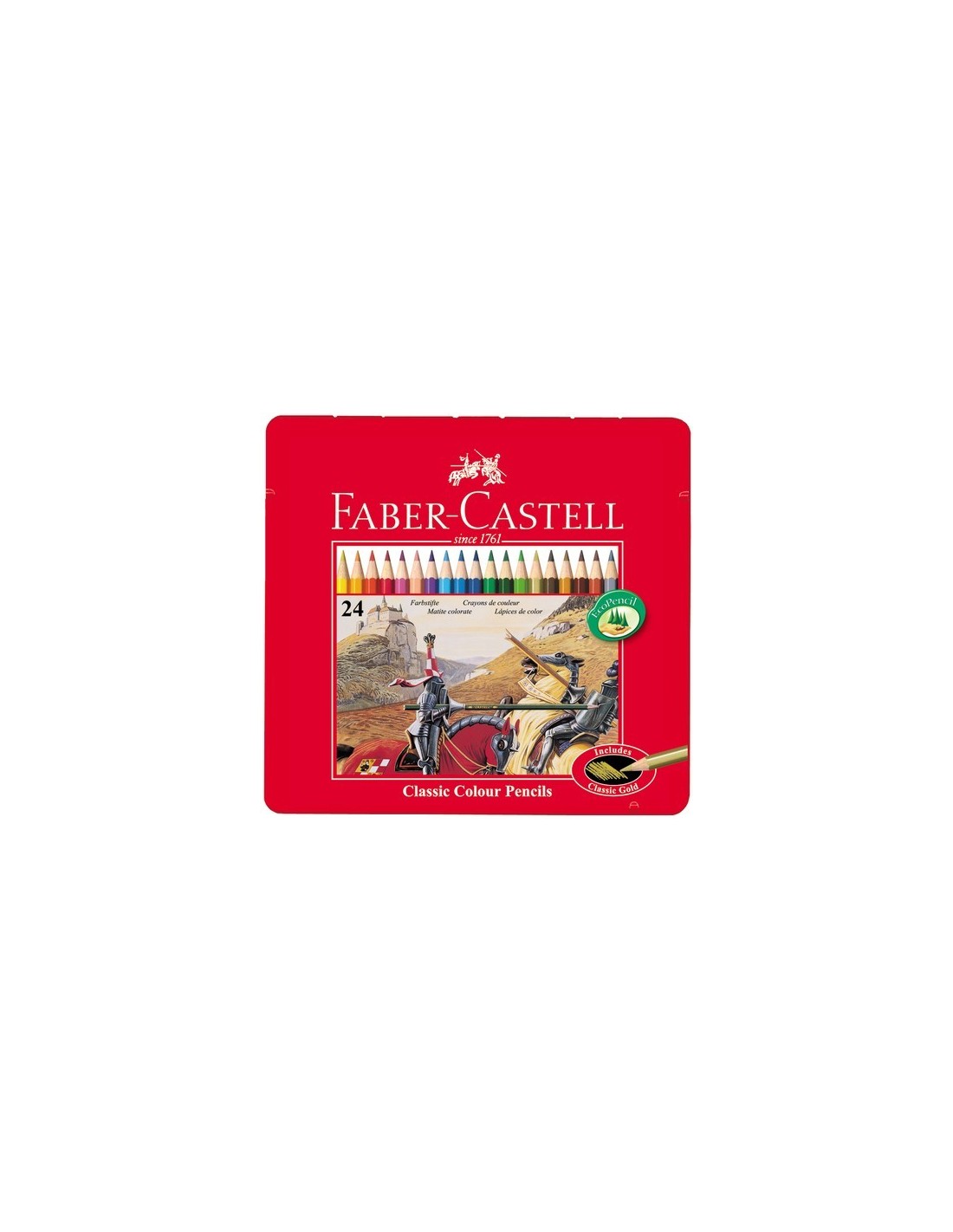 Ecolápices de color de alta calidad con forma hexagonal. Colores intensos y brillantes de aplicación extra suave. Mina de 3,3 mm de Ø protegida contra la rotura por el proceso especial de encolado sv. Con espacio para escribir el nombre. Estuche de metal de 24 lápices (incluye color oro metálico).