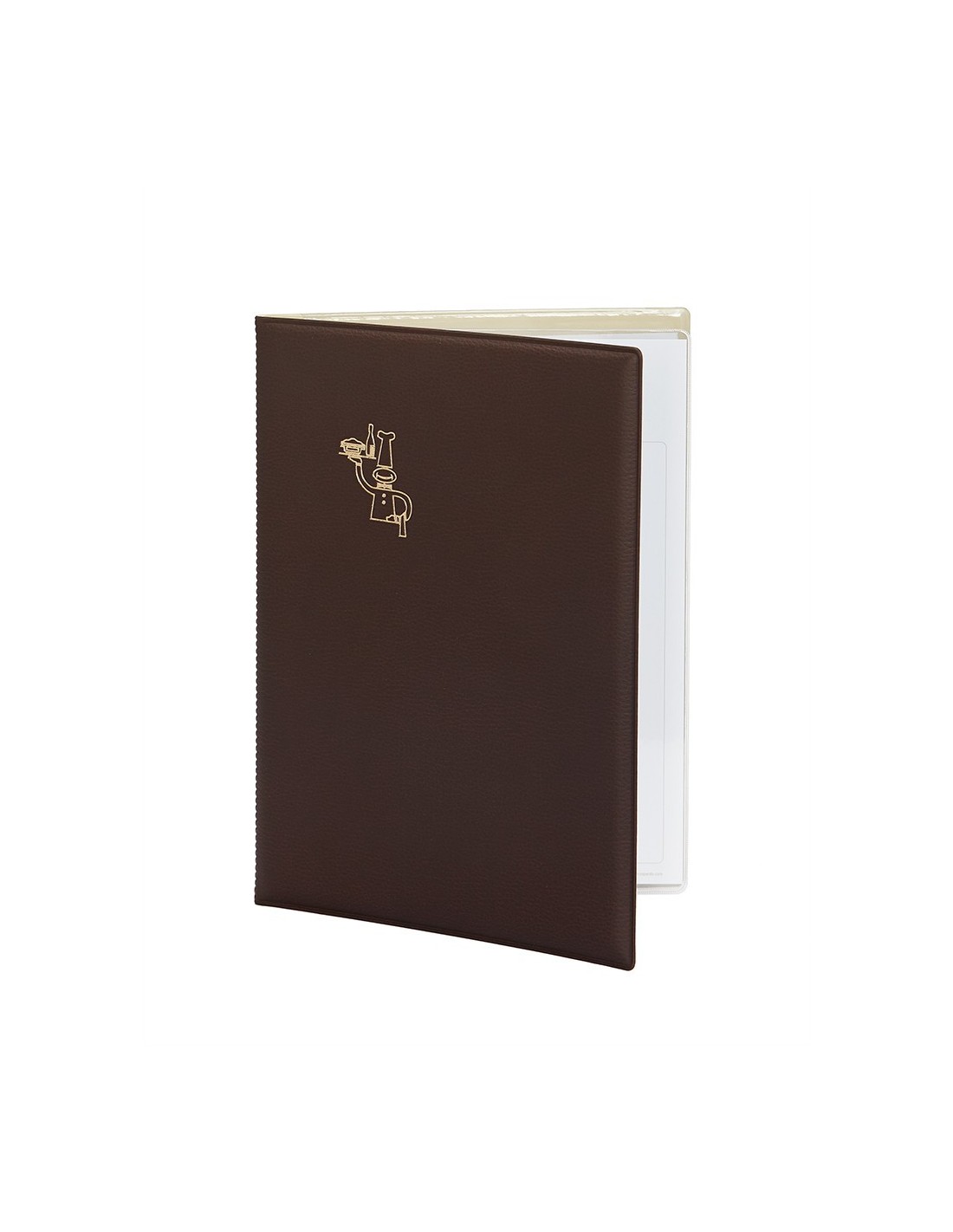 Carpeta porta-menús acolchada con material de polipiel. 4 fundas transparentes provistas de láminas para los menus. La portada de la carpeta tiene un impreso en color dorado color burdeos