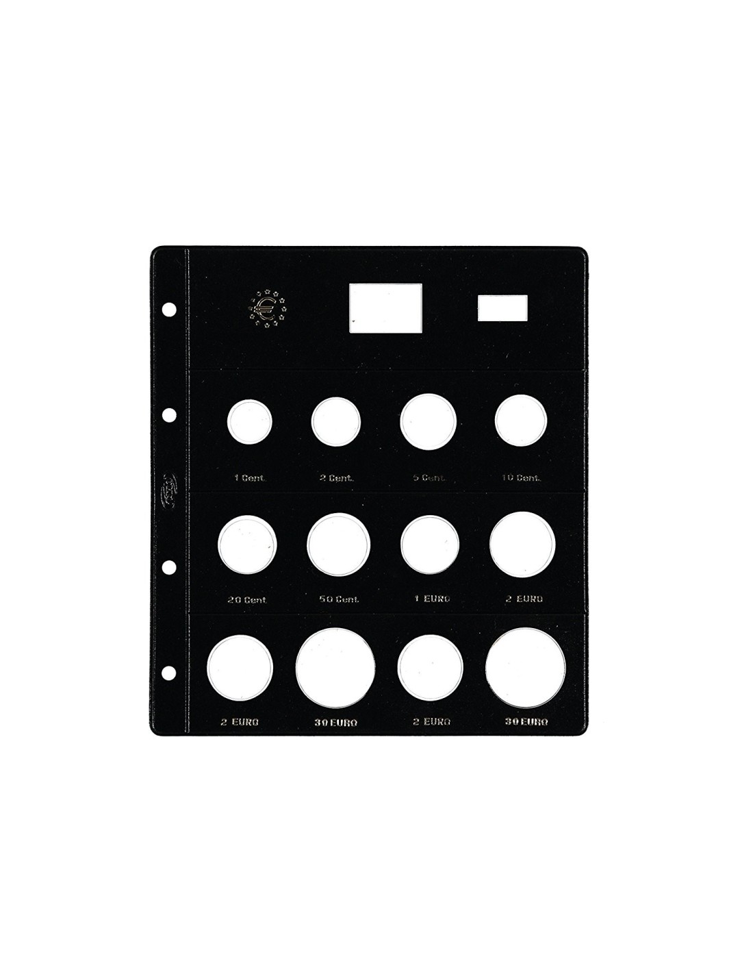 Fundas tipo claraboya para euros. Especialmente diseñadas para alojar todas las monedas de euros (1,2,5,10,20, 50 céntimos y 1 y 2 euros). Ademas de otros alojamiento para personalizarlas colocando la bandera del pais y el año correspondoiente. Cada hoja incluye una cartulina separadora, una bandera y un año. Las hojas llevan grabadas en oro los valores de cada moneda i el anag