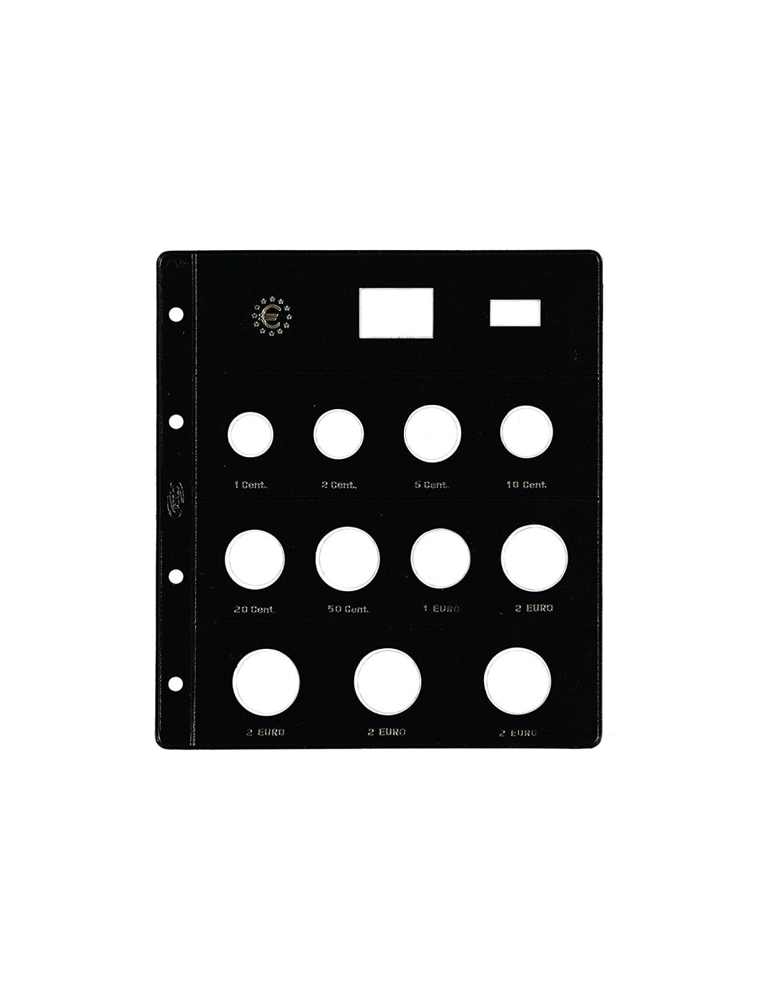 Fundas tipo claraboya para euros. Especialmente diseñadas para alojar todas las monedas de euros (1,2,5,10,20, 50 céntimos y 1 y 2 euros). Ademas de otros alojamiento para personalizarlas colocando la bandera del pais y el año correspondoiente. Cada hoja incluye una cartulina separadora, una bandera y un año. Las hojas llevan grabadas en oro los valores de cada moneda i el anag